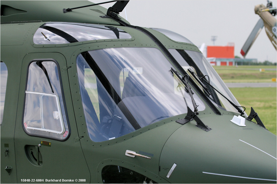 Front right quarter view. Cockpit windows, windscreen wipers, cable fenders, crew door. |