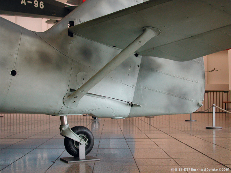 Tail wheel, stabilizer struts and rudder viewed from port.