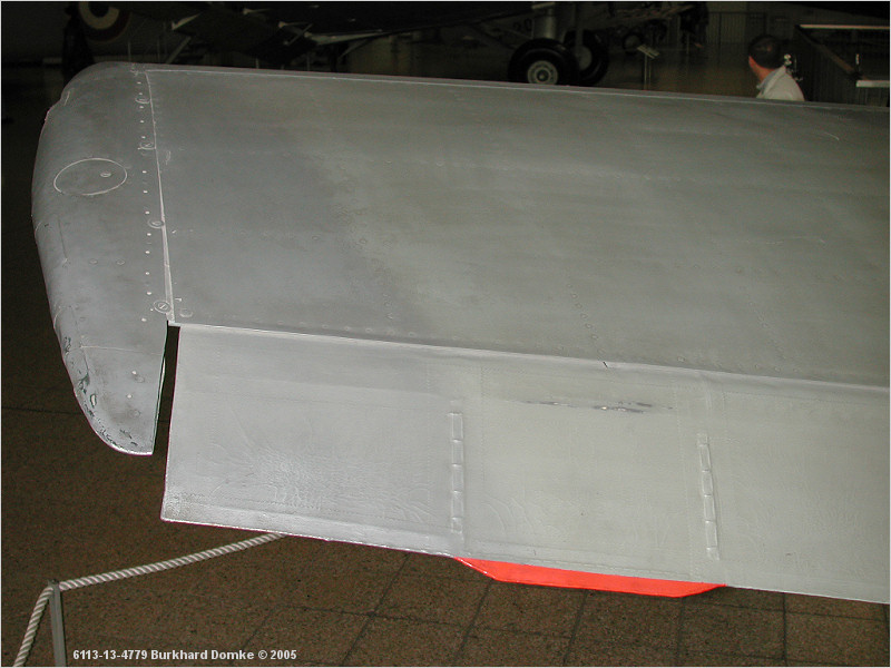 Port wing tip. Fabric-covered aileron has a fixed trim tab (red). Note skin buckling at upper right of photo, |