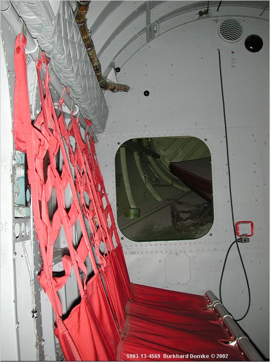 Cabin interior, port rear quadrant. Missing panel reveals baggage/equipment stowage compartment.
