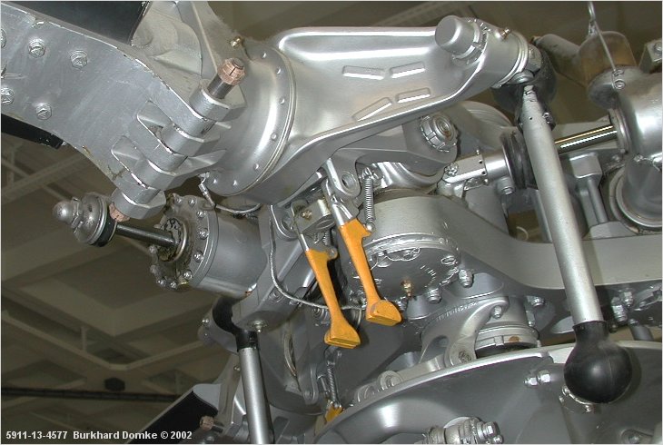 Note pitch horn and control link to swashplate (top center), blade root attachment detail (top left) and
