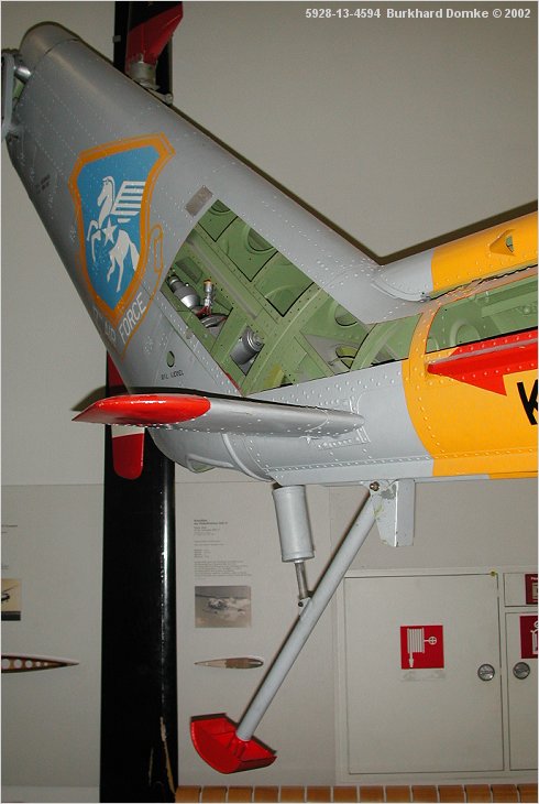 Tail fin, horizontal stabilizer and tail bumper. Cut-out reveals tail rotor drive shaft and bevel gear.