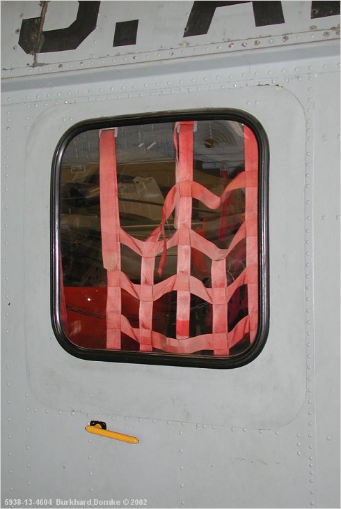 Port rear cabin window/emergency exit. Note emergency release handle (yellow)