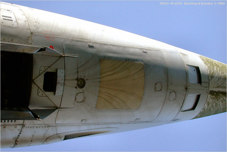 Nose section between landing gear bay and radome viewed from below. Unpainted area is lower UHF aerial flush-mounted to cockpit floor access panel. |