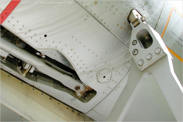 Rear right booster trestle-to-fuselage attachment fitting viewed from rear. Arrester hook and centerline ventral fin are partially visible at left. |