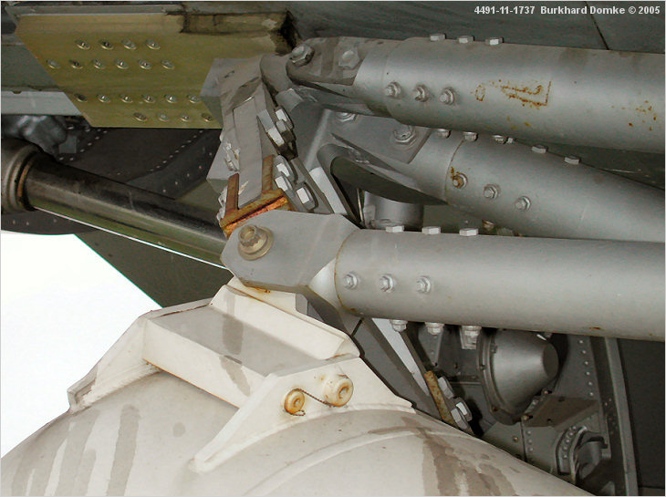 Front booster attachment viewed from left. Note heavy brass-colored doubler at upper left used to introduce booster loads into the aircraft's keel beam. |