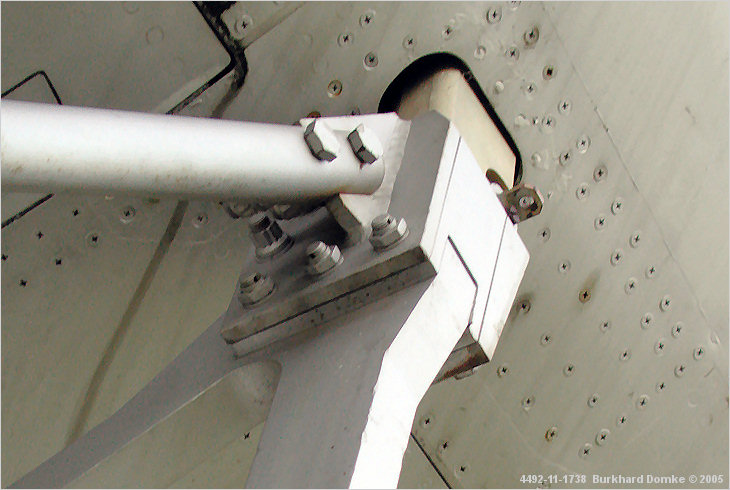 Rear left booster trestle-to-fuselage attachment viewed from ahead. |