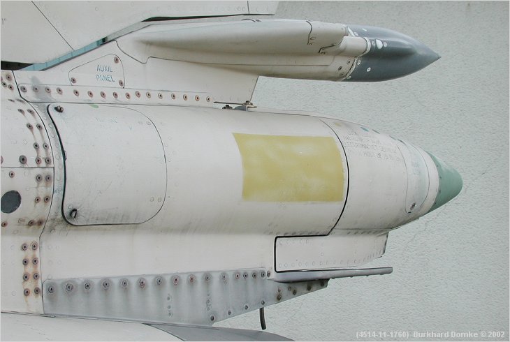 Brake-chute fairing viewed from port. Bullet at base of rudder houses Sirena-3 radar warning receiver.