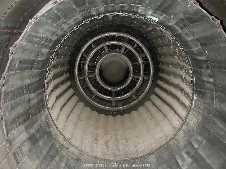 View into afterburner can shpwing flameholder rings, liners and nozzle petals. Nozzle is fully open.