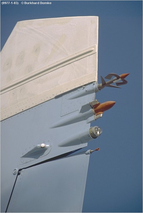 Port vertical tail mounts (top down) ILS aerial, ECM antenna, position light and electrostatic discharger.