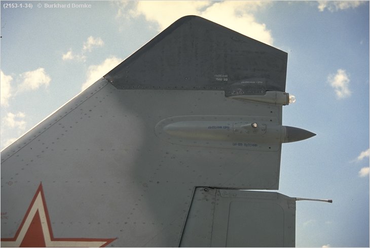 Port vertical tail. Protuberances are (top down) tail navigation light, Sirena-3 ESM fairing with white RWR pimple and electrostatic discharger wick on top end of extended-chord rudder. |