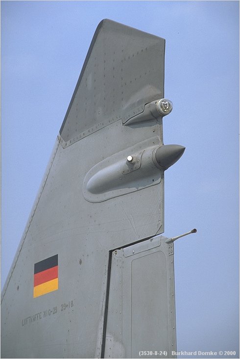 Port vertical tailplane detail. (Top down) tail navigation light, ESM receiver with RWR dimple, and electrostatic discharger wick. |