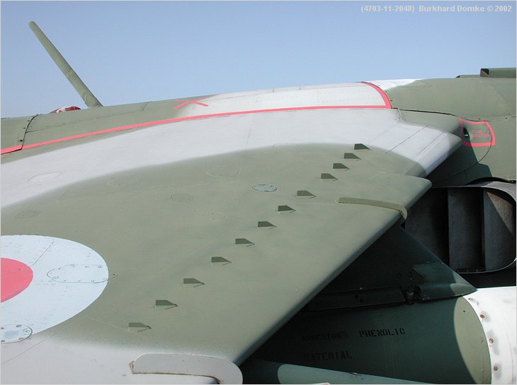 Starboard wing leading edge. Note vortex generators, double sawtooth and leading edge fences
