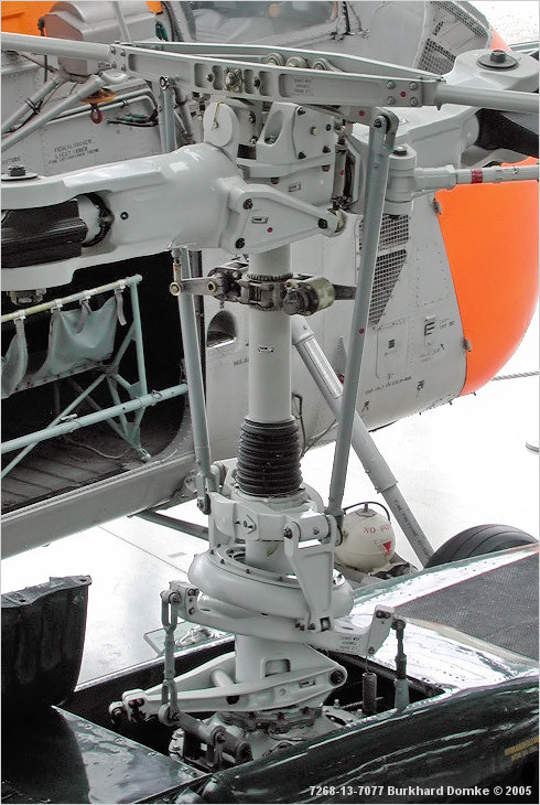 Main rotor mast, rotor head, and swashplate assembly viewed from above.