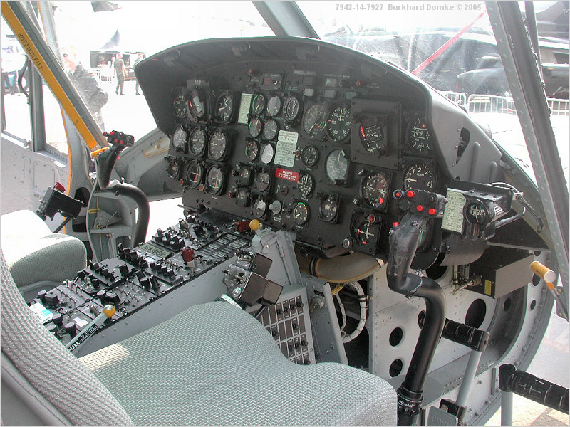 Cockpit interior, instrument panel, center console, control sticks and yaw control pedals.