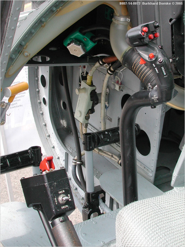 Cockpit interior, copilot's cyclic stick, collective lever, and yaw control pedal detail.