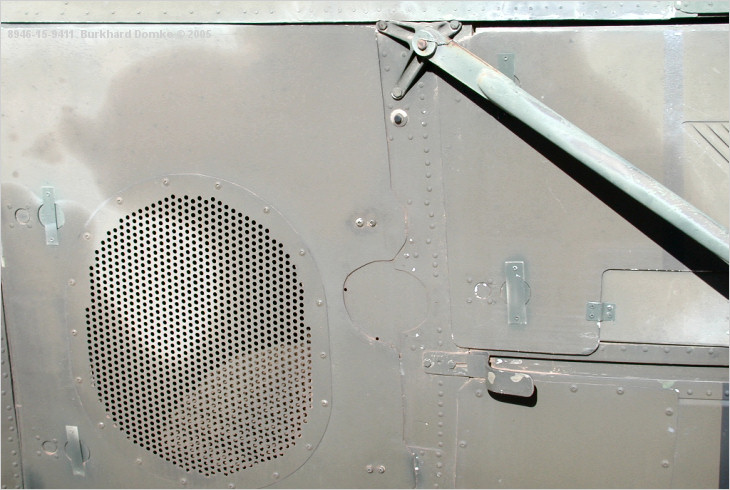 Starboard weapon system mount rear brace attachment. Rear stop of sliding cabin door is at lower right |