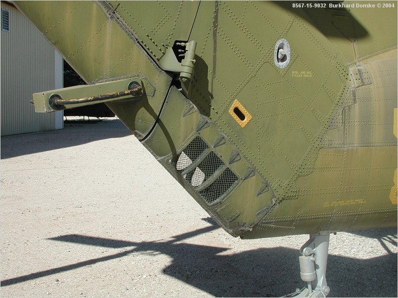 Starboard side of tail boom and fin root area. Note towel rack antenna, lower tail fin/rotor fold hinge and tail rotor drive oil filler cap (grey). |
