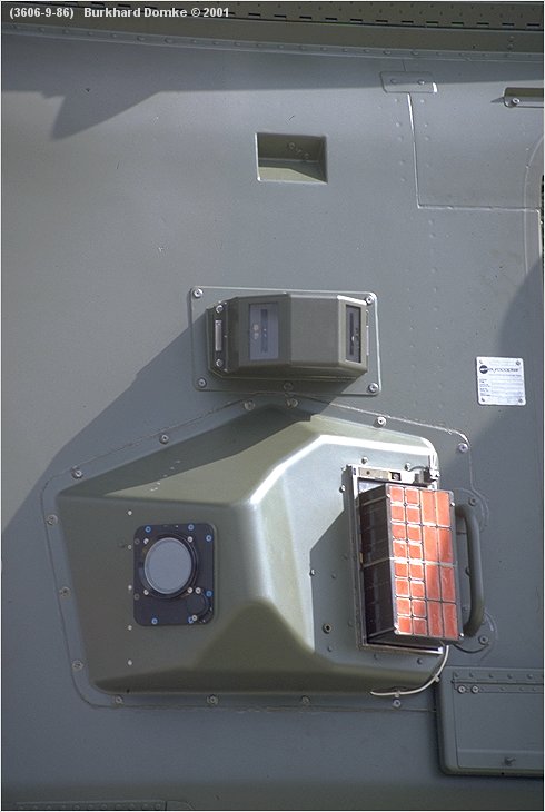 Starboard rear defensive systems array, comprising missile warning receiver, IRCM and chaff/flare dispenser.