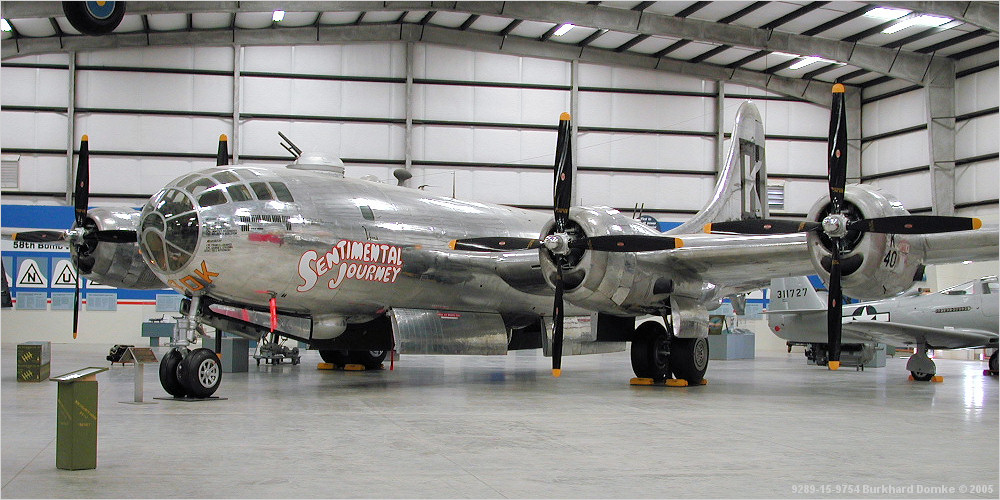 Front left quarter view. B-29-75-BW 44-70016 "Sentimental Journey" originally flew with the 330th Bomb Group, 20th Air Force from Guam. |