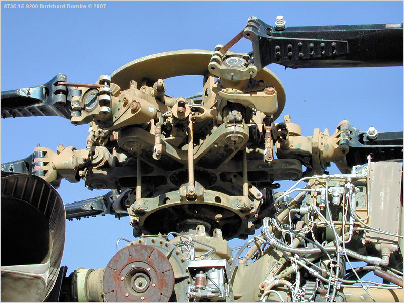 Main rotor head viewed from port. Note rotor brake disc at bottom left.