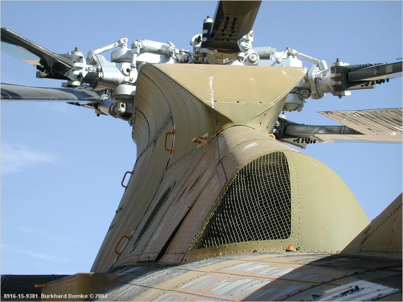 Main rotor pylon, main rotor head with blades in folded/stowed position. |