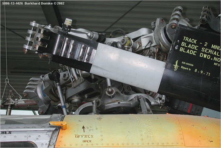 Main rotor head viewed from port. Blade is in folded position.
