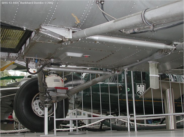 Main landing gear attachment fittings and support rods. Note engine oil radiator at upper left.