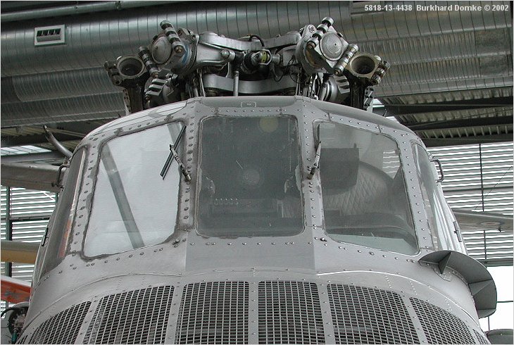 Flight deck viewed from ahead. Strake at right shields co-pilot's view from exhaust glare. Note main rotor head with blades in folded position.