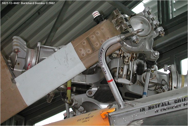 Main rotor head and blade root detail viewed from starboard. Note pitot probe.