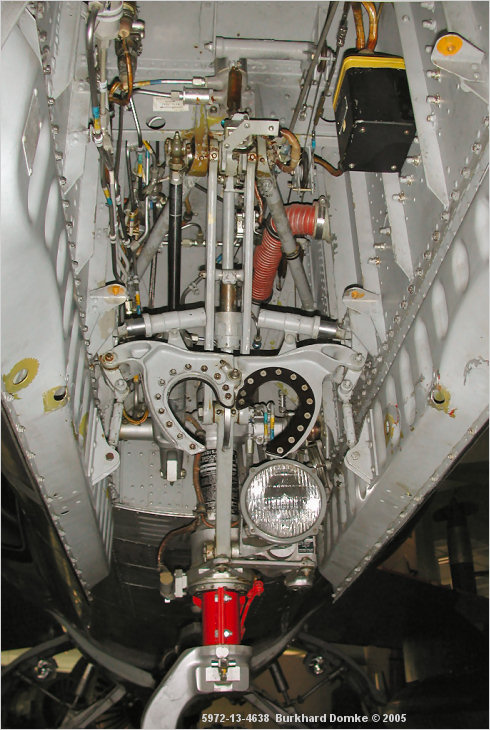 Nose landing gear well interior, looking aft. Note horseshoe-shaped scissor-type uplock above landing light. |