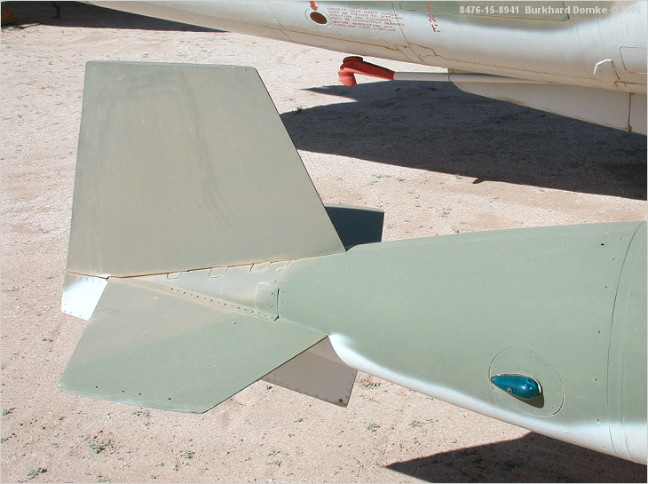 Tail section of starboard wingtip fuel tank close up. Starboard navigation light is blue-green. |