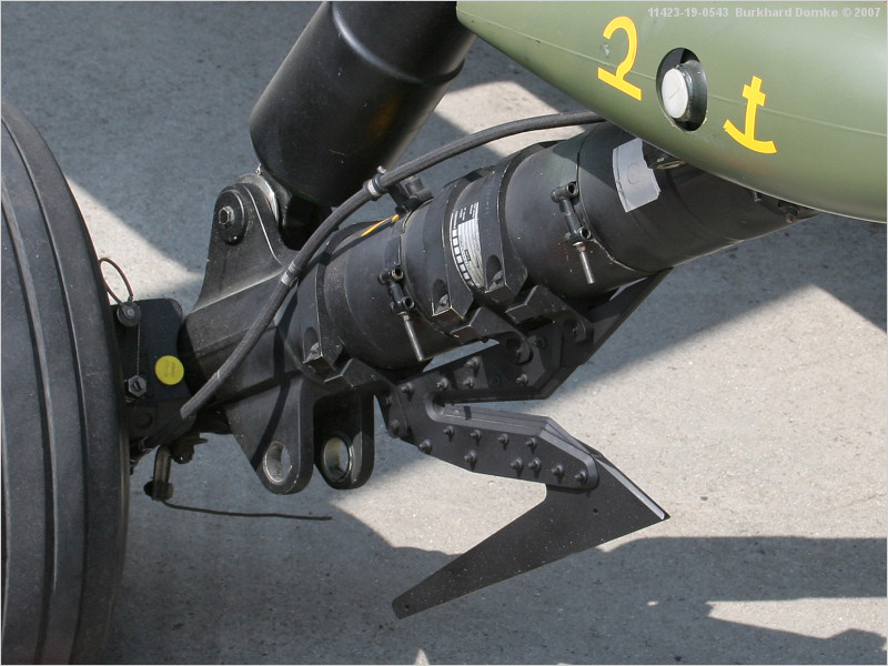 Main landing gear leg close-up. Note cable deflector/cutter. MLG legs are identical and interchangeable left and right, hence the duplicated attachment lugs. |
