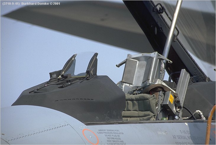 Front cockpit HUD, instrument coaming and ACES II ejection seat close-up.