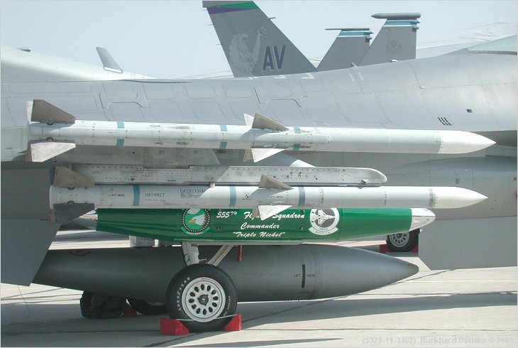 AIM-120A can be carried on wing tips outboard wing stations. Note 555th CO's chrome-tipped travel pod.
